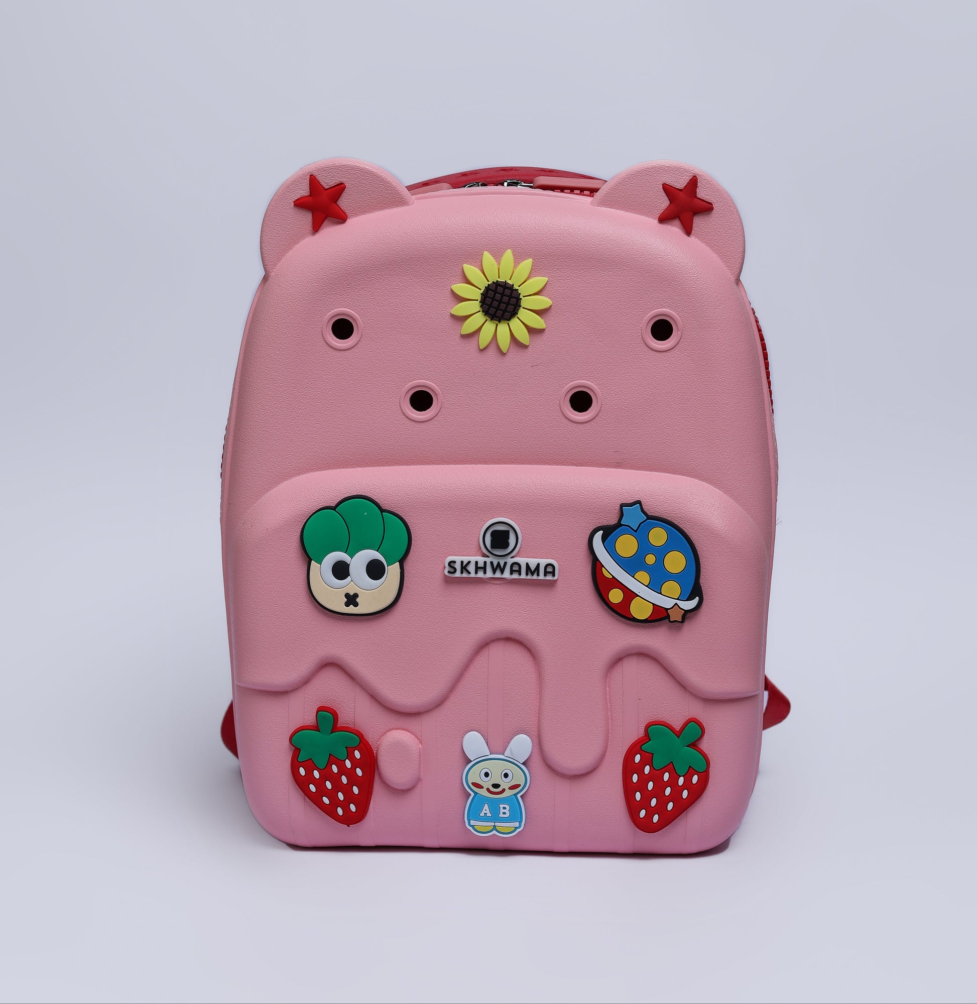 The Pink EVA (Ethylene-Vinyl Acetate) backpack bag is a versatile bag perfect for creche, play days and everyday use. The top zip makes it quick and easy to access your child’s essentials. The front of the bag features charm holes for the SKHWAMA logo and other removable charms that can be easily swapped or added to for a personalized look. The shoulder straps are adjustable